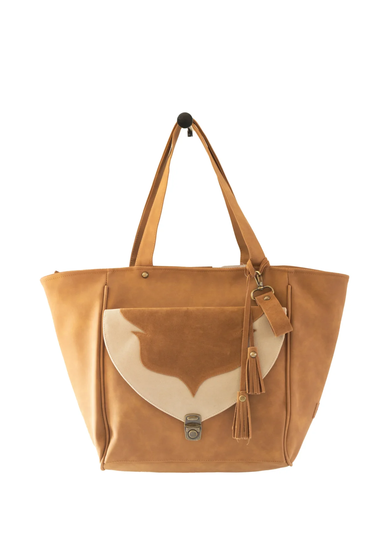 Bolso camel con solapa bicolor y hebilla metálica, estilo western chic