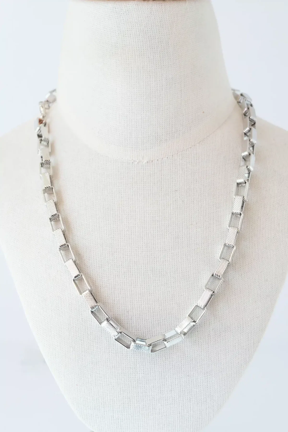 Cadena plateada de eslabones rectangulares con diseño moderno.