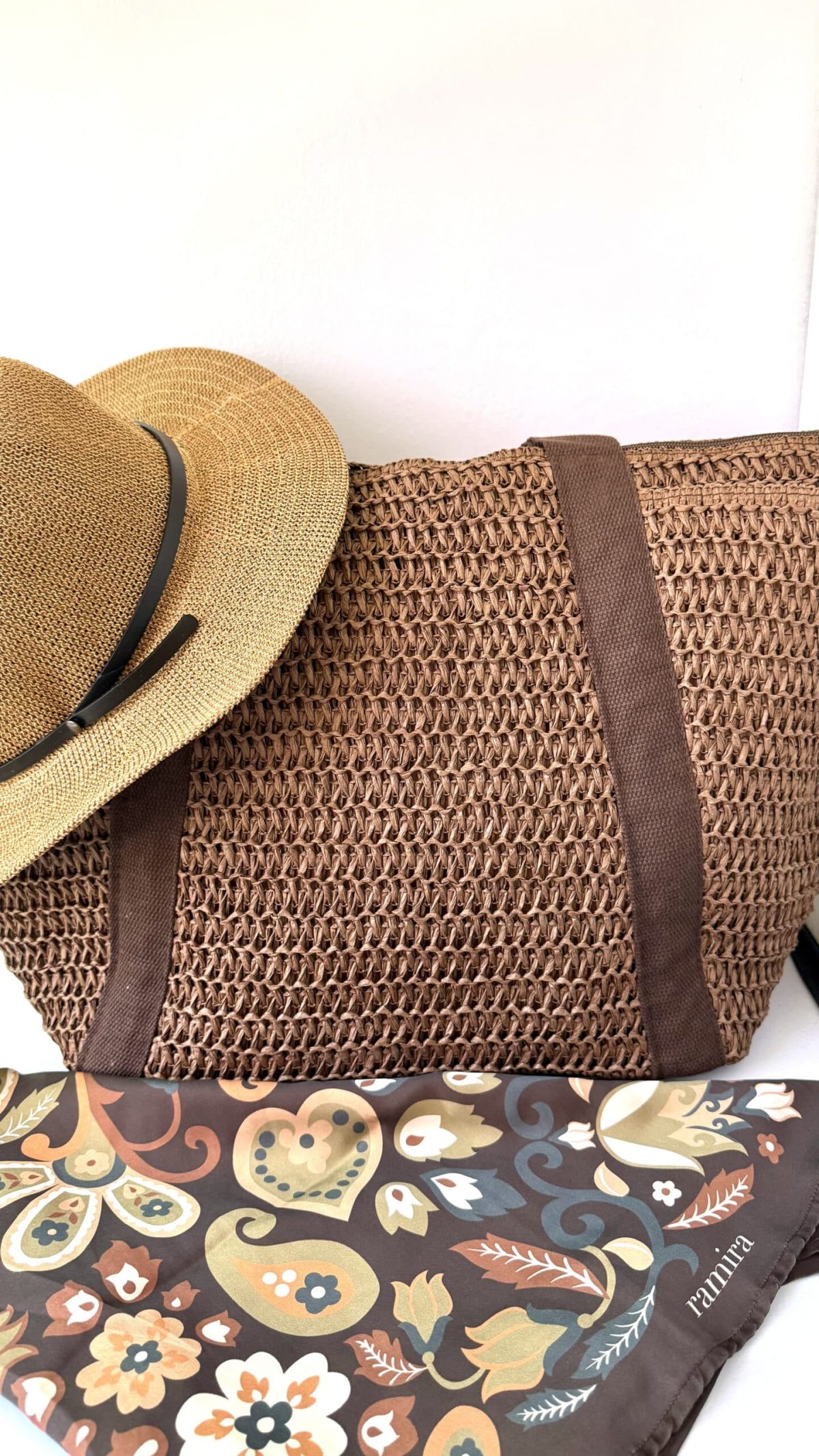 Incluye un bolso de rafia amplio, perfecto para llevar todo con comodidad; un pañuelo estampado de tonos cálidos, ideal para usar de mil maneras; y un gorro tipo fedora, liviano y clásico, que aporta elegancia y protección bajo el sol.