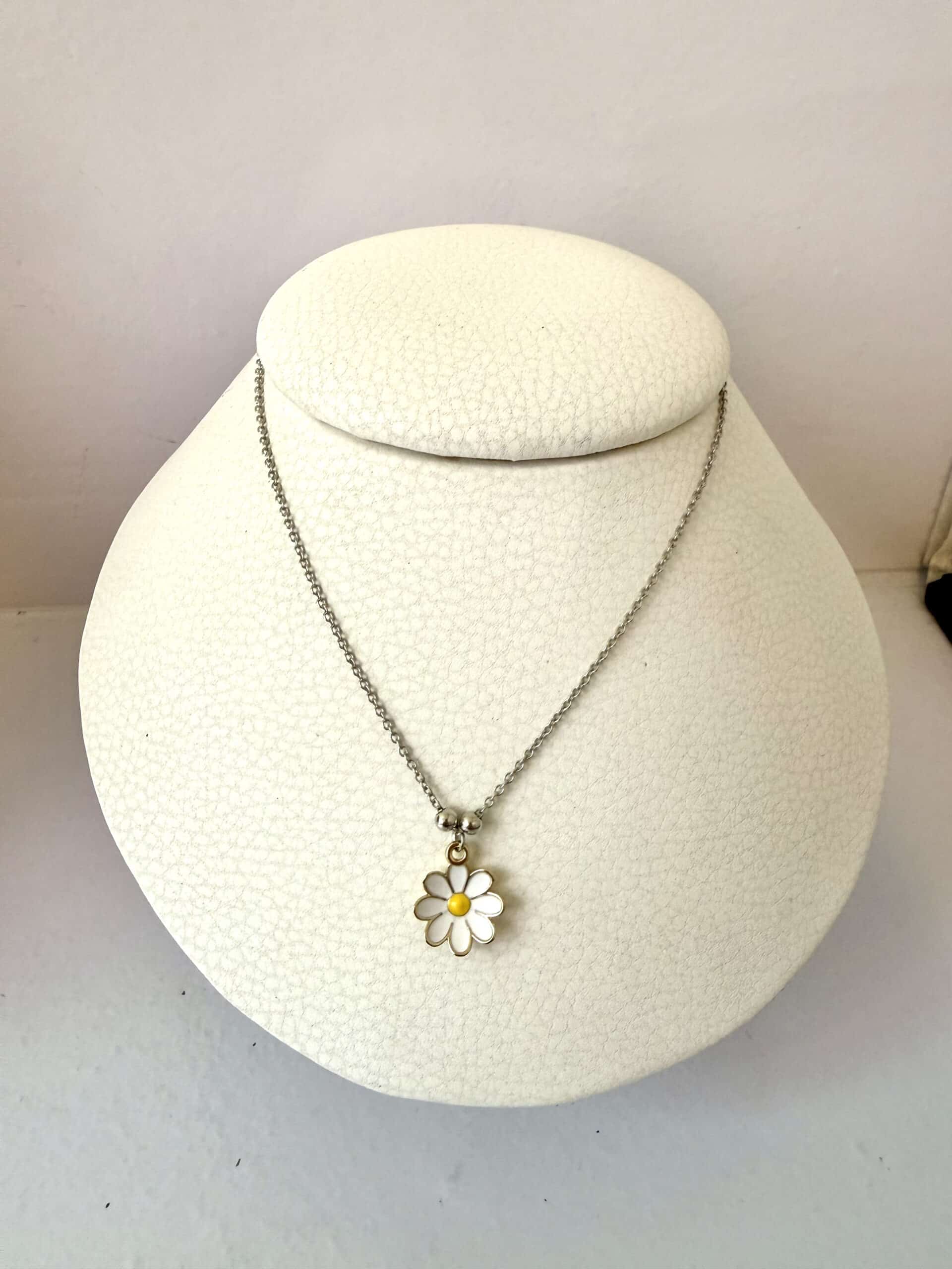 Cadena fina con dije floral. Hipoalergénico, resistente al agua y al uso diario. Una pieza simple, luminosa y súper combinable.