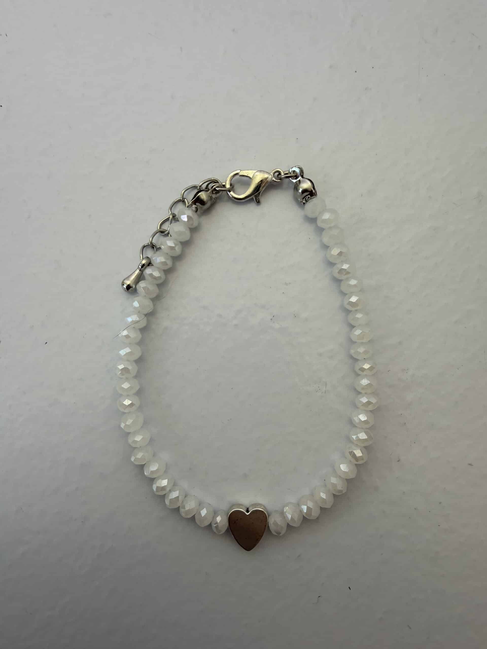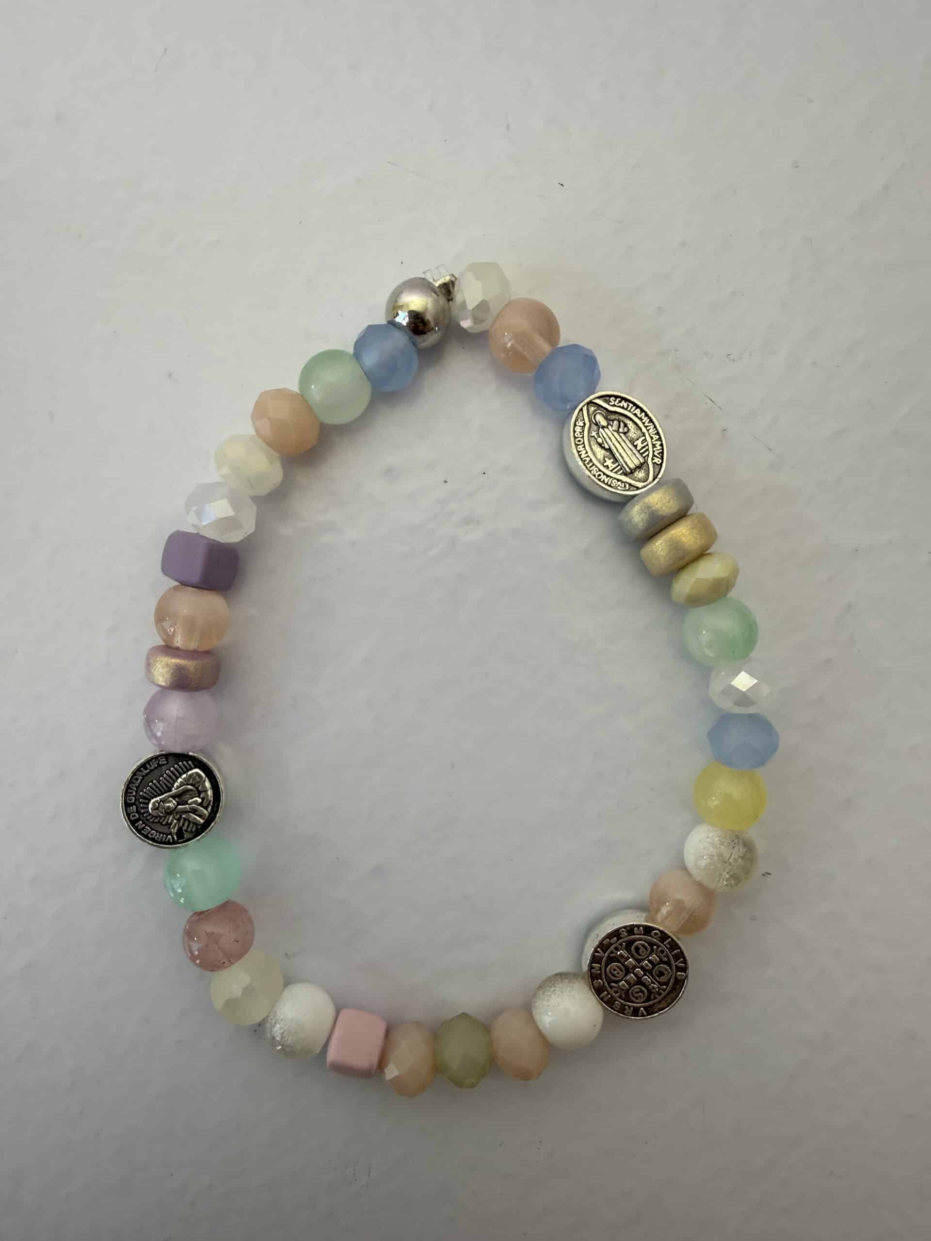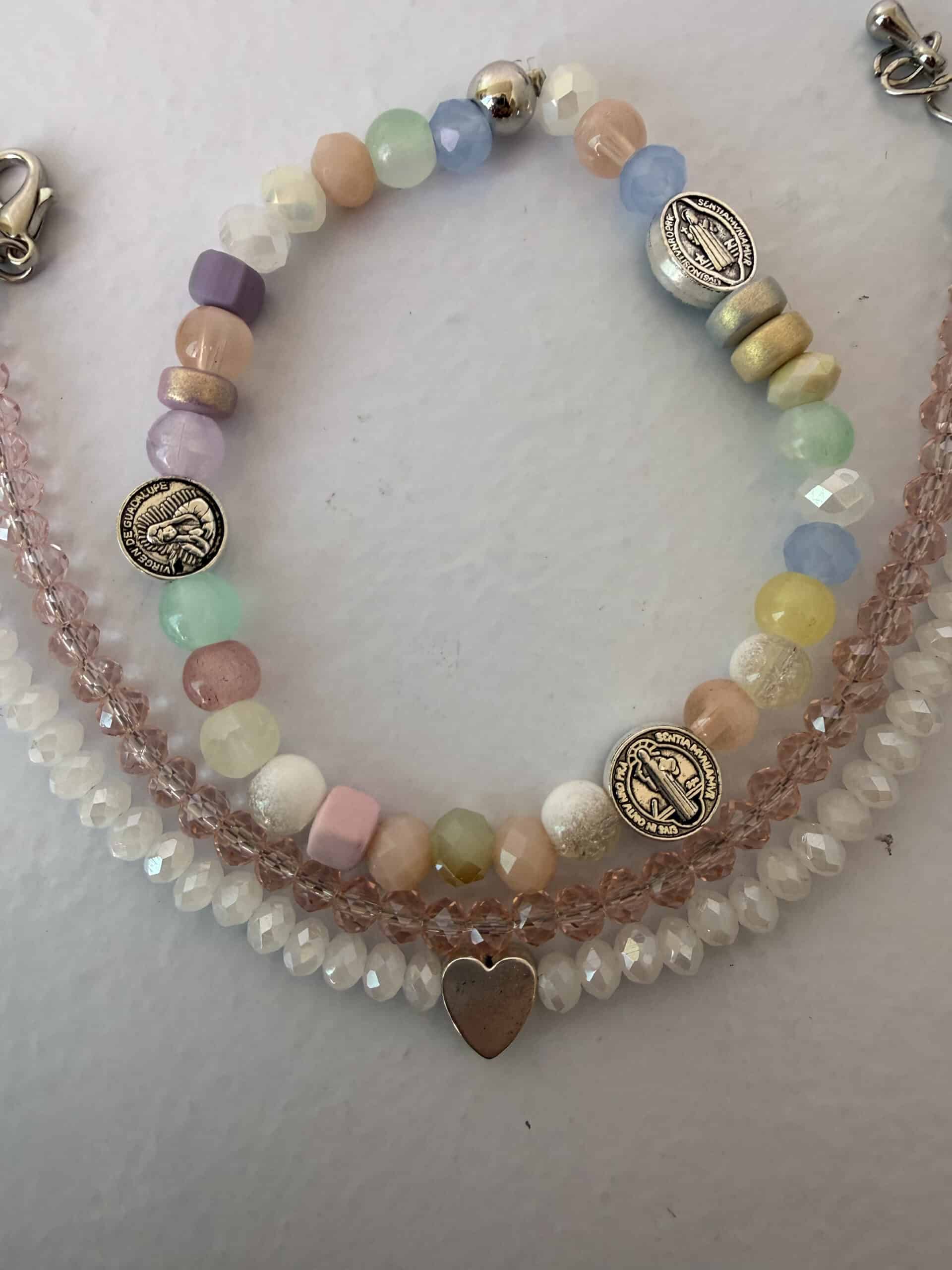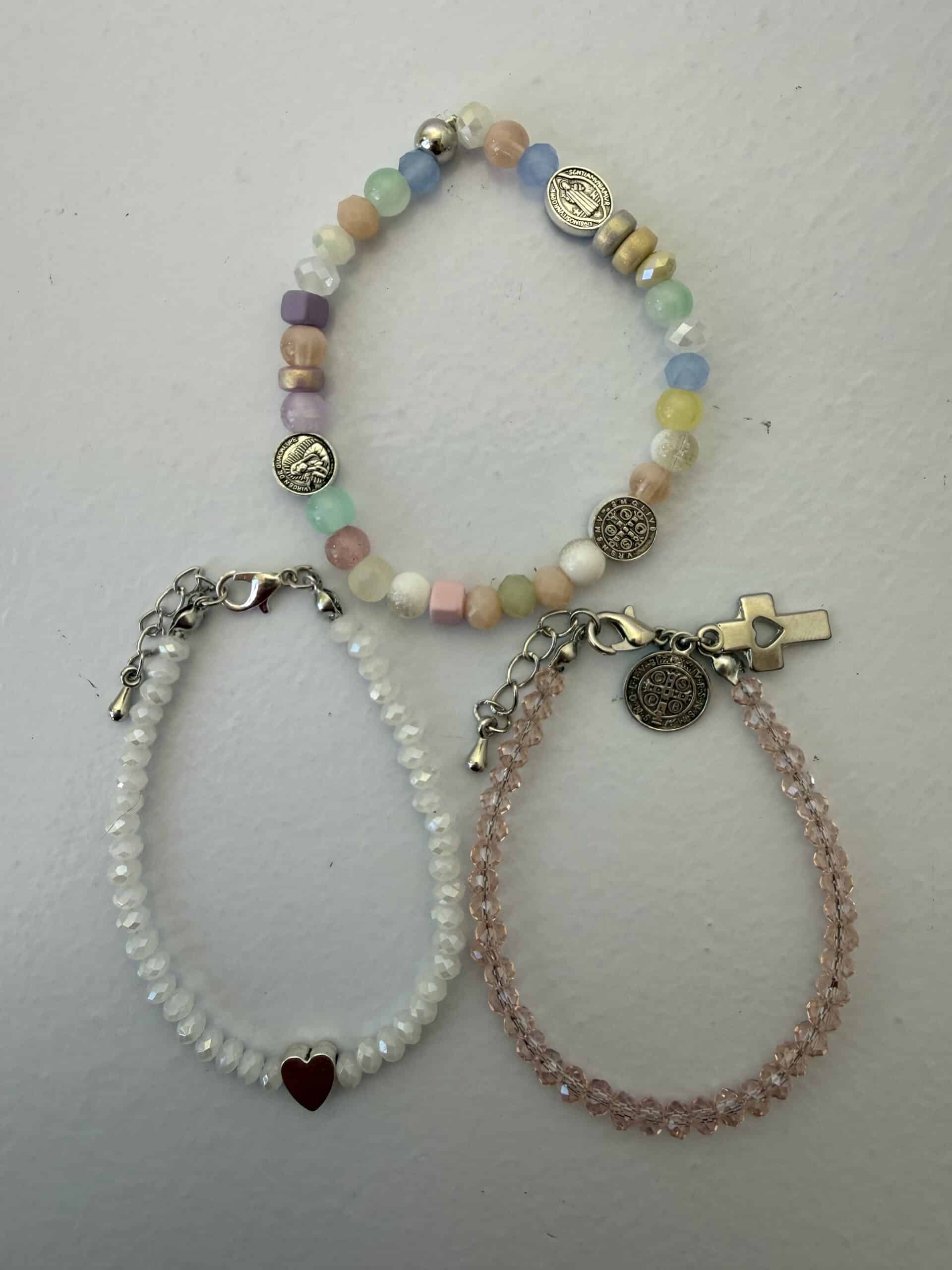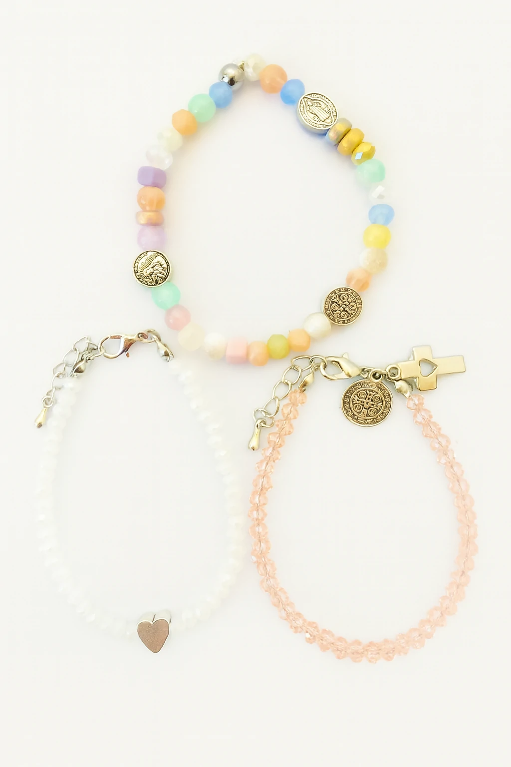 Combo de tres pulseras delicadas y súper combinables: una blanca nacarada con corazón, una de cristales rosa con cruz y San Benito, y una elástica multicolor pastel. Elegancia, brillo y color en un set único.