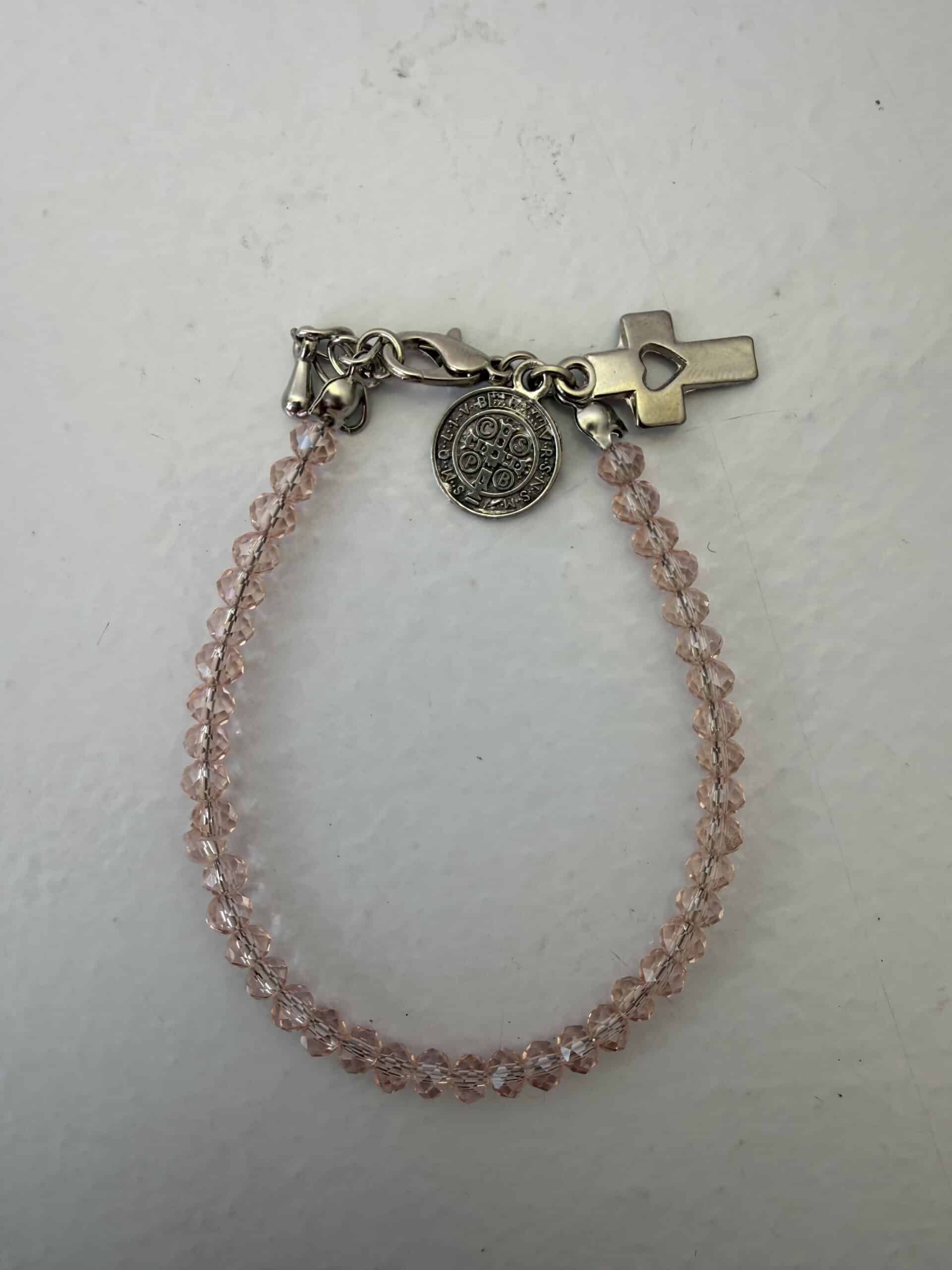 ✨ Pulsera de cristales rosa con cruz y San Benito