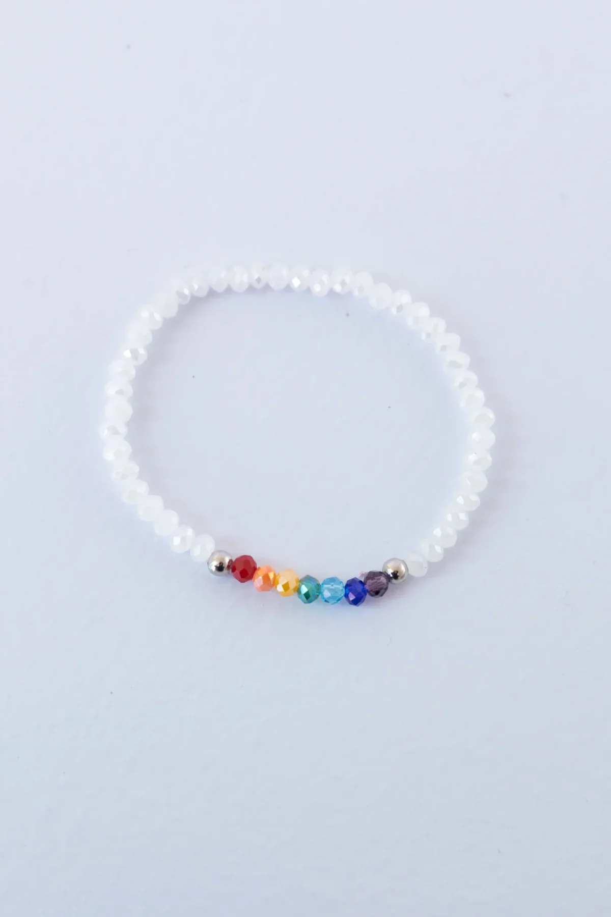 Pulsera de cristales blancos con detalle de cuentas en colores de los 7 chakras.