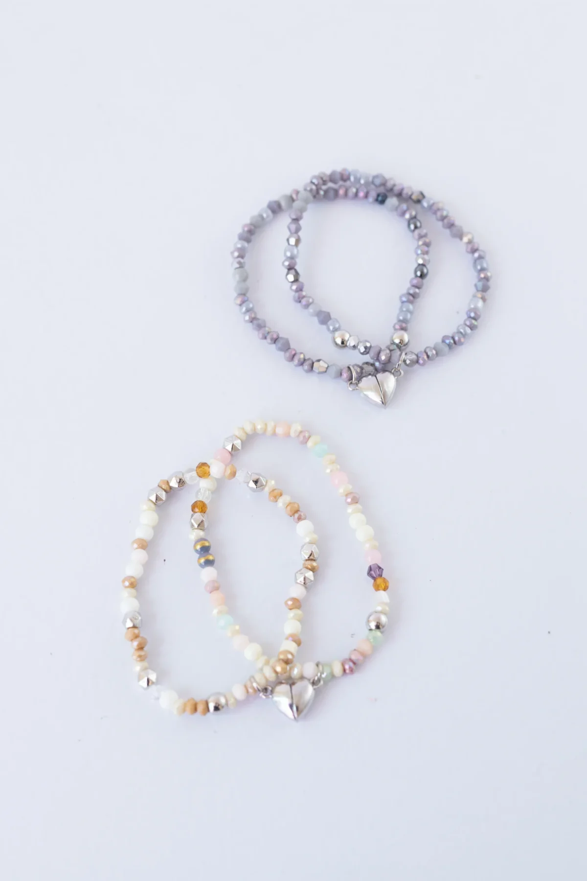 Pulsera de cristales con dije de corazón imantado, en tonos pastel y nácar.